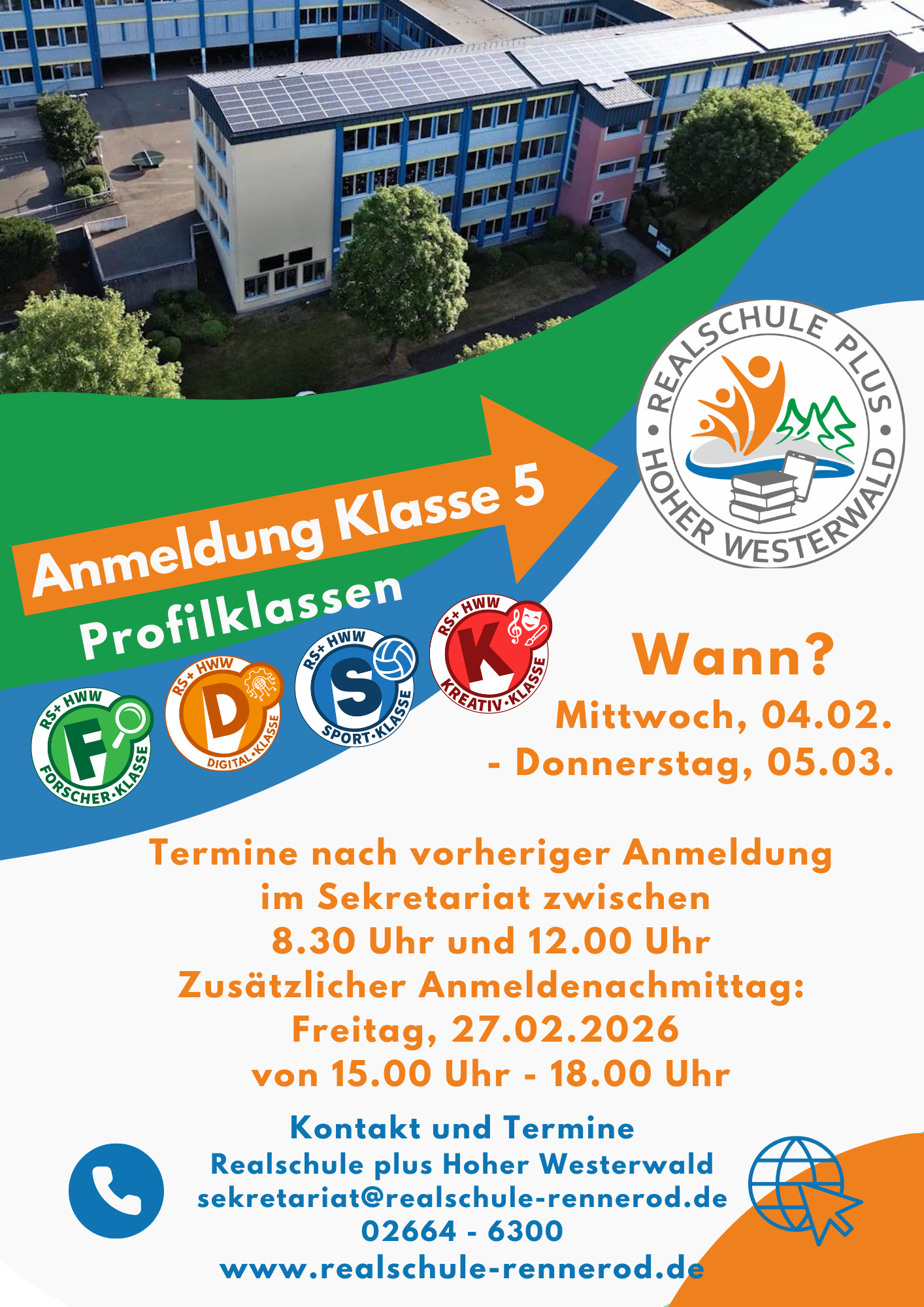 Die Anmeldung für das Schuljahr 2026/27 erfolgt im Zeitraum vom 4.2. bis 5.3.2026 zwischen 8.30 Uhr und 12.00 Uhr nach vorheriger telefonischer Terminvereinbarung mit dem Sekretariat (02664 6300). Am Freitag, den 27.02.2026 werden auch Termine am Nachmittag vergeben.