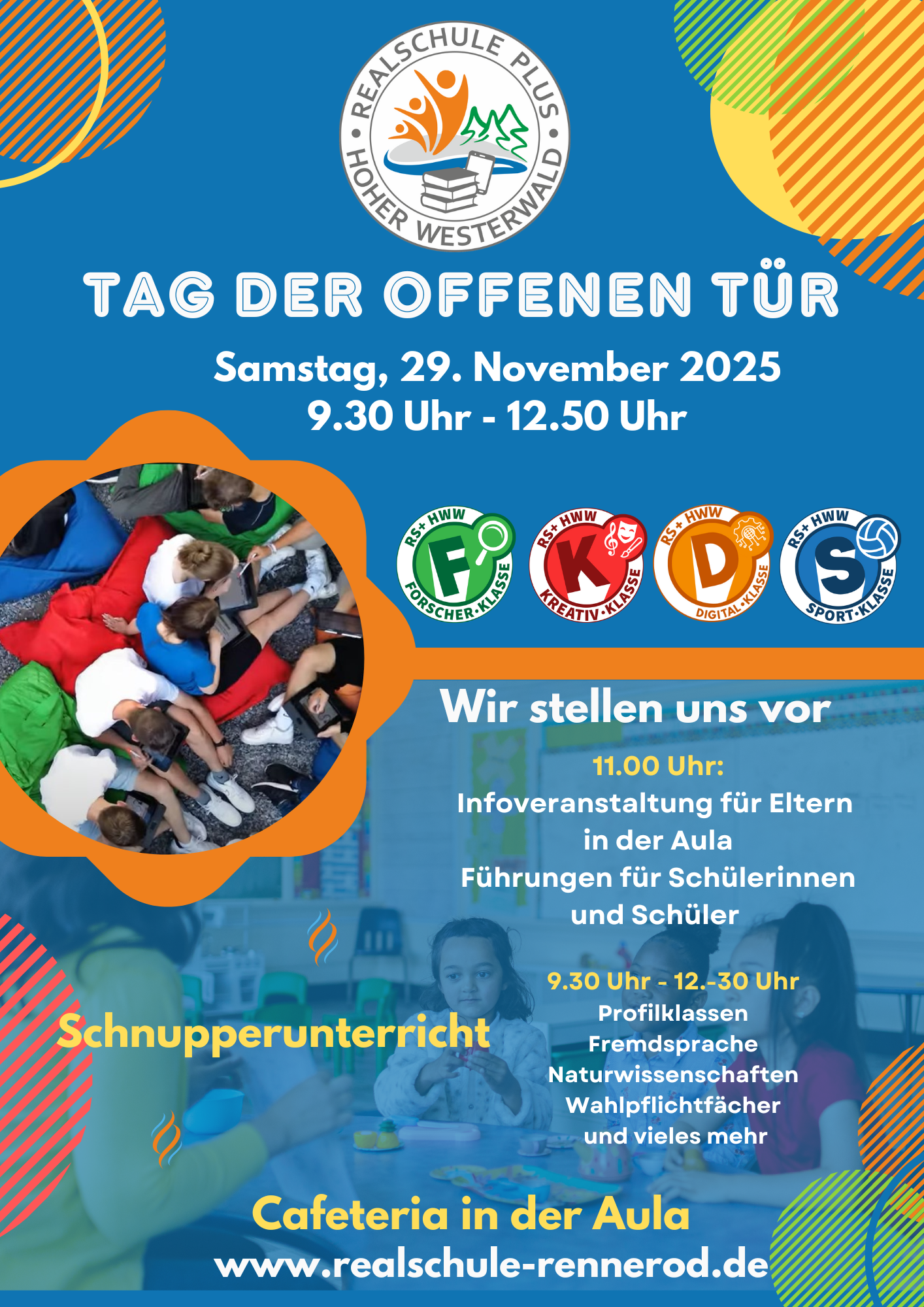 Am Samstag, den 29. November öffnet unsere Schule ihre Tür für alle interessierten Kinder der vierten Schuljahre. Natürlich sind die Eltern und Sorgeberechtigten mit eingeladen.
