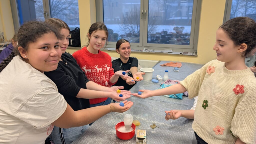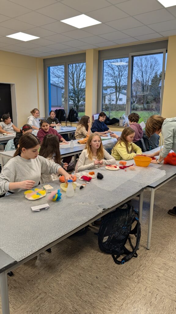 In der AG „Nadel und Faden“ von Ines Benner wurde es in den vergangenen Wochen besonders kreativ. An drei Nachmittagen beschäftigten sich die Schülerinnen und Schüler intensiv mit der Technik des Filzens mit Schafwolle. Angeleitet wurden sie dabei von Elena Ermert, die über viel Erfahrung in diesem Handwerk verfügt.